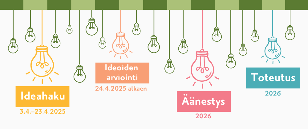 - Ideahaku-vaiheessa (3.–23.4.2025) pääset jättämään ideasi, joita osallistuvan budjetoinnin määrärahalla voitaisiin toteuttaa.
