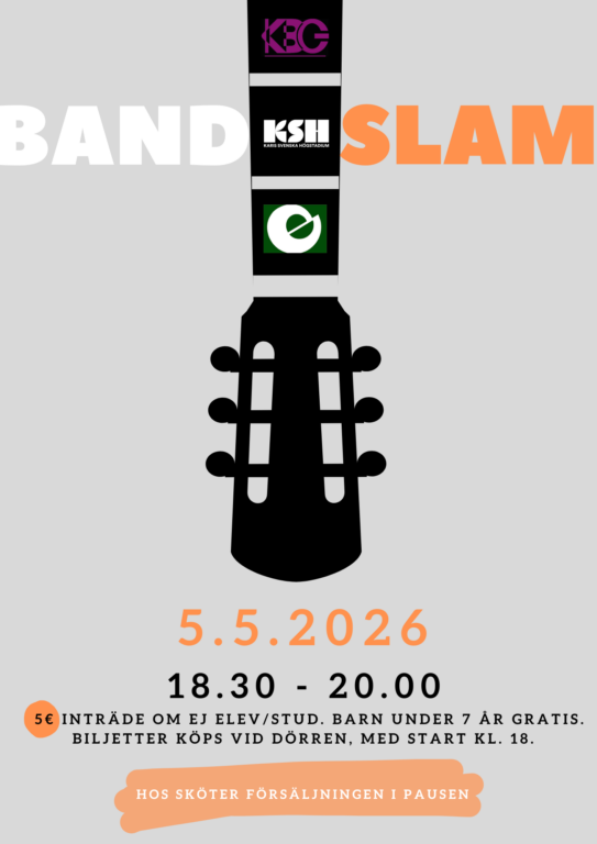 Det har igen blivit dags att låta traktens unga musiker visa vad de går för. Välkommen att njuta av Bandslam tisdagen den 5 maj! På scenen i år ser ni band från Karis svenska högstadium, Karis-Billnäs gymnasium och Ekenäs gymnasium.