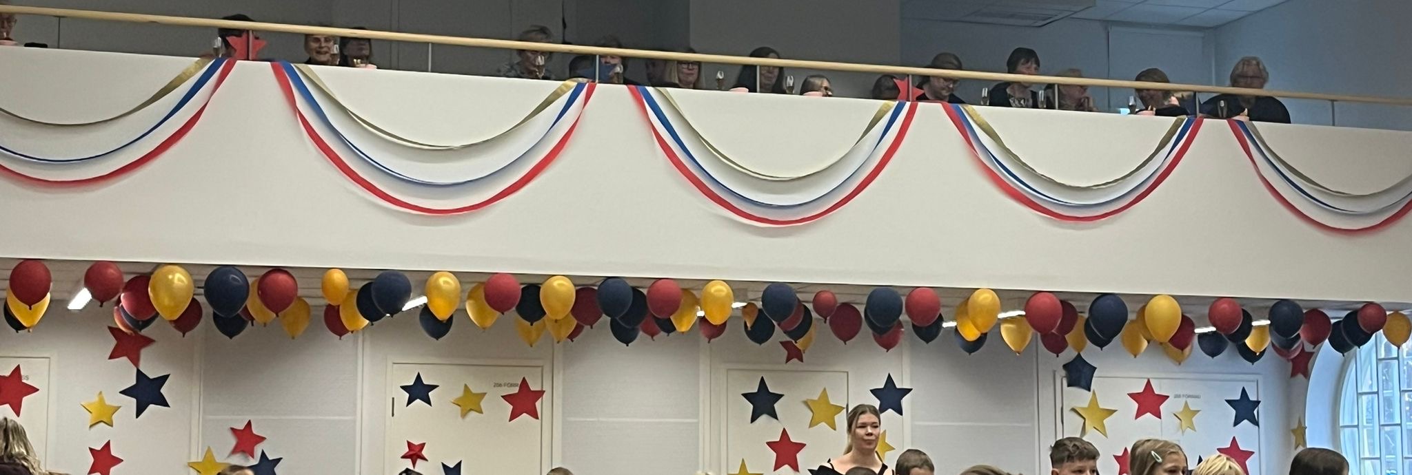 Hela festsalen var dekorerad med ballonger och pappersstjärnor.