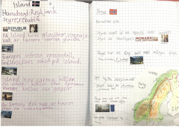 Innan vi började lära oss om ett land hade vi en gissningslek “Vart är vi på väg?” där vi fick ledtrådar om ett land och skulle gissa vilket land vi skulle lära oss om. Sen skrev vi i häftet om länderna och ritade kartor.