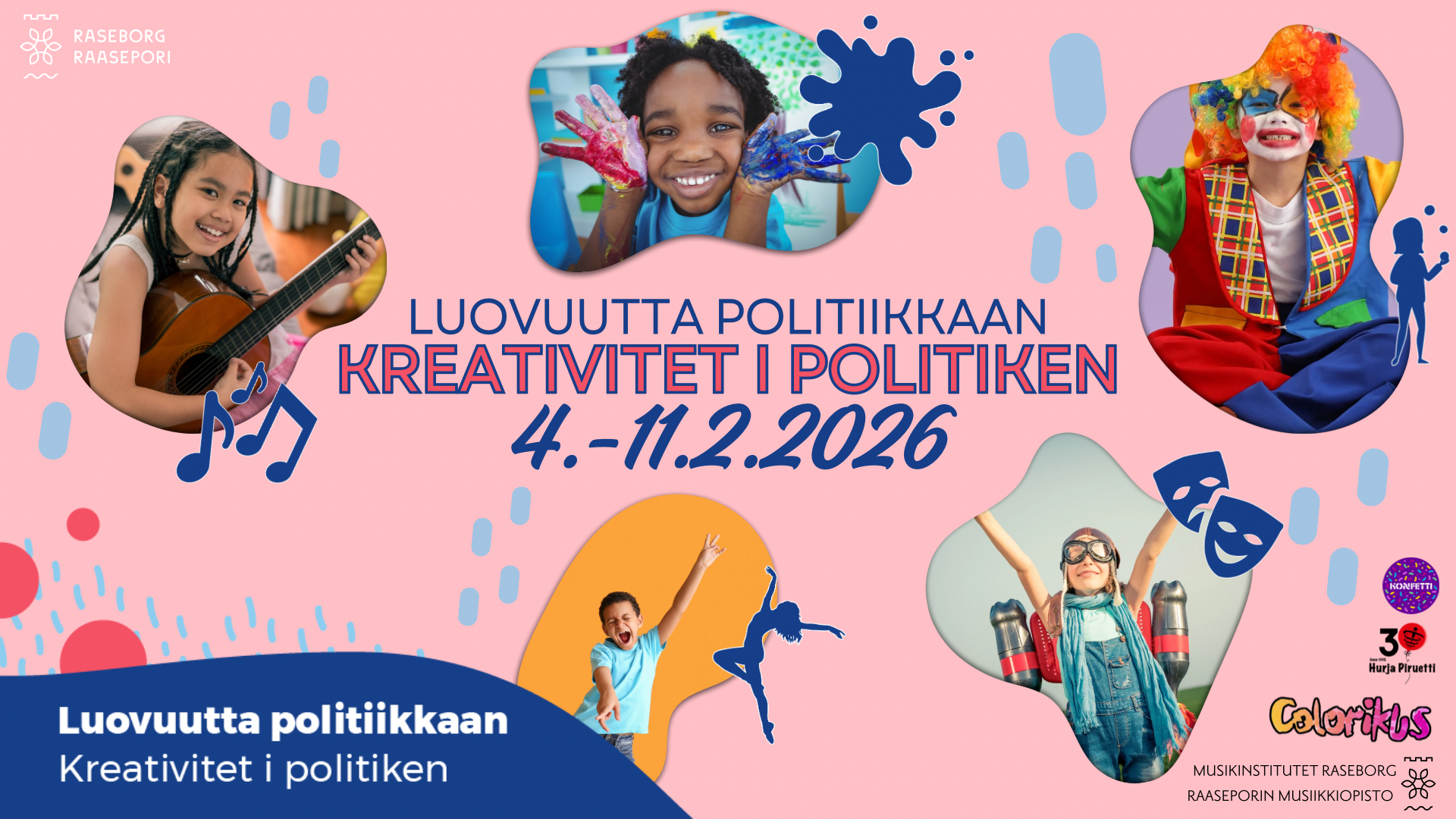Luovuutta politiikkaan -viikon aikana 4.–11.2.2026 taiteen perusopetuksen oppilaitokset avaavat ovensa kaupunkien päättäjille, viranhaltijoille, sekä elinkeinoelämän ja median edustajille Raaseporissa, Hangossa ja Inkoossa. Viikon aikana järjestetään avoimia tilaisuuksia, tulevaisuusdialogeja nuorten kanssa sekä esityksiä ja keskusteluja taiteen ja kaupunkikehityksen teemoista.