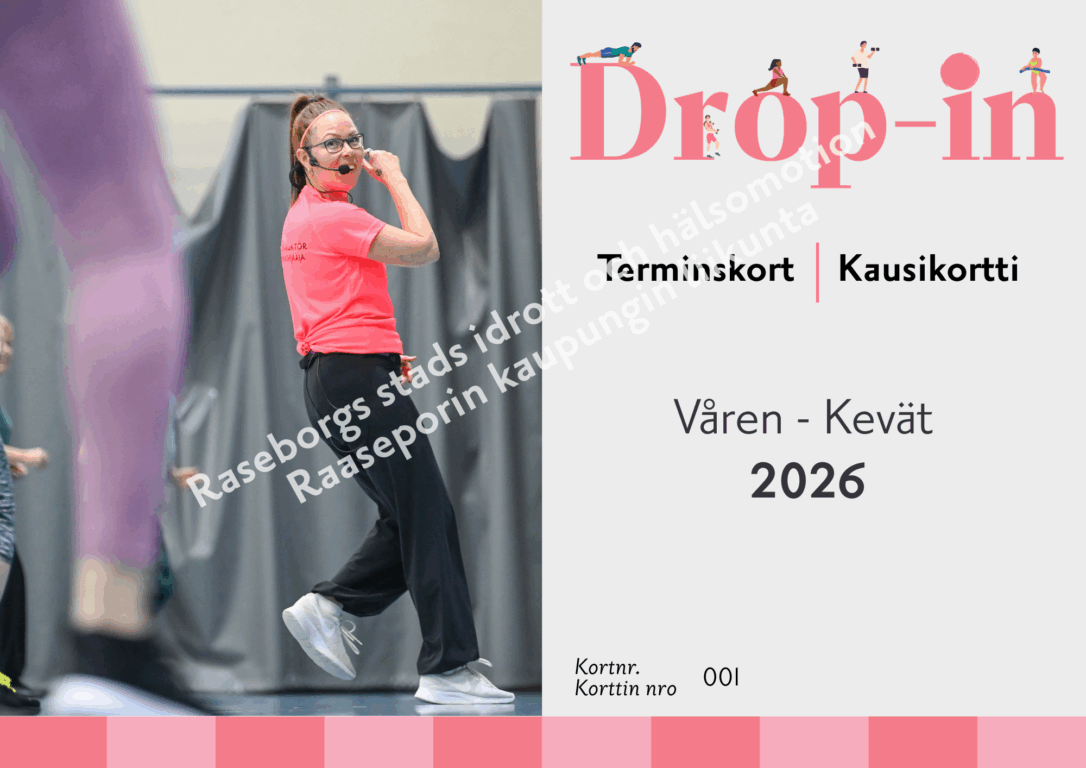 Syksystä 2025 alkaen voit ostaa myös kausikortin drop-in liikuntaryhmiin. Kortilla voit osallistua kaikkiin Raaseporissa lukukauden aikana järjestettäviin drop-in-ryhmiin. Kortin voi ostaa Tammisaaren uimahallin kassalta ja se maksaa 80€.