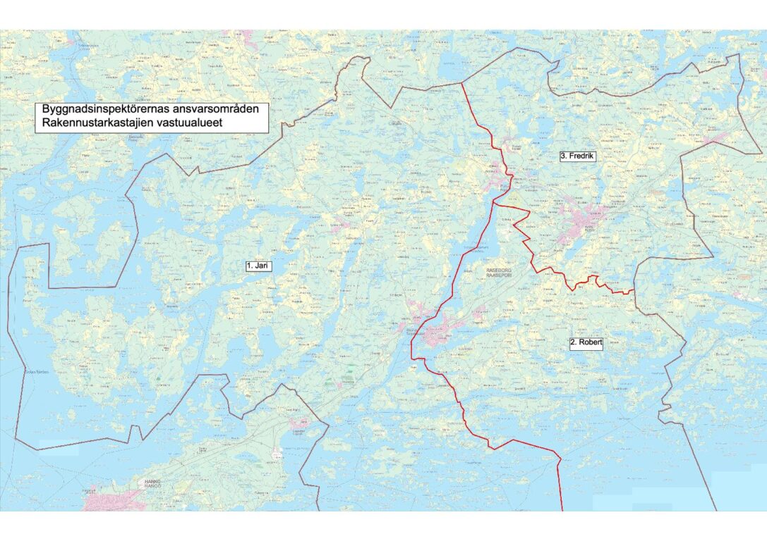 Meidät on jaettu vastuualueisiin, mikä käytännössä tarkoittaa, että tietty rakennustarkastaja vastaa omasta alueestaan ja tekee päätökset siinä. Kaikki rakennustarkastajat neuvovat ja käsittelevät lupia kaikilla alueilla. Viime kädessä tulkinnanvaraisissa kaavakysymyksissä vastuualueen tarkastaja päättää tulkinnasta. Alla aluejako (voit myös ladata Vastuualueet-PDF:n).
