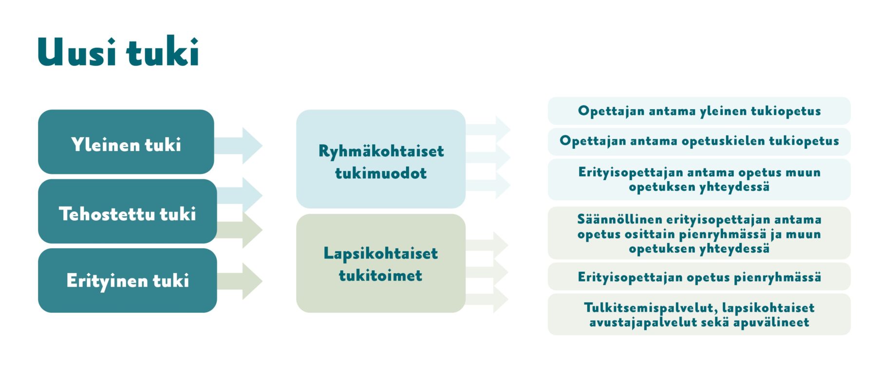 Tämä tarkoittaa, että esiopetuksessa olevalla lapsella on oikeus saada tukea oppimiseen ja esiopetukseen osallistumiseen silloin, kun hän sitä tarvitsee. Tuki voi olla ryhmäkohtaista tukea tai lapsikohtaista tukia.