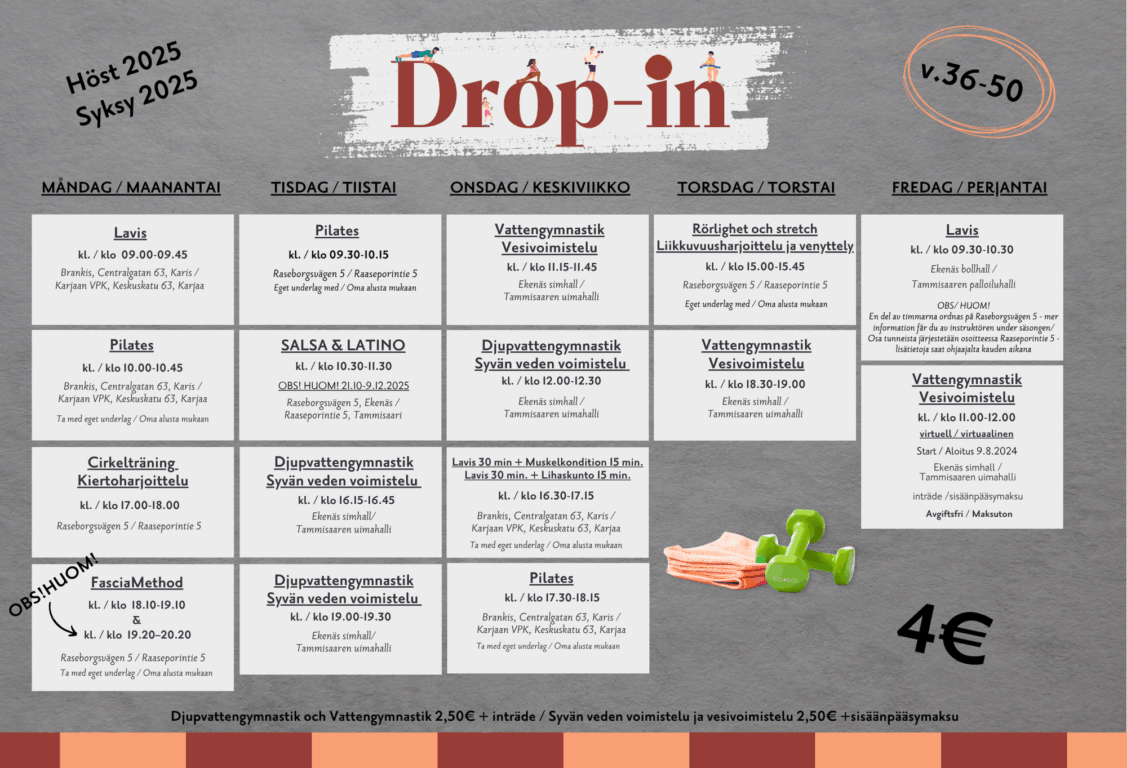 Från och med hösten 2025 kan du köpa ett terminskort för drop-in -motionsgrupperna. Kortet ger dig möjlighet att delta i alla drop-in -grupper som arrangeras i Raseborg under en termin. Kortet köps från Ekenäs simhallskassa och kostar 80 €.