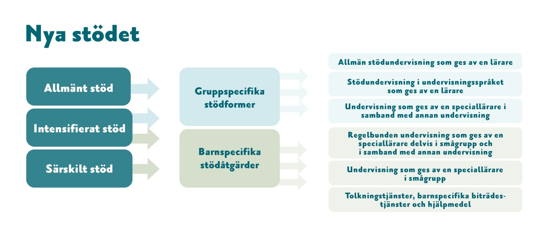 I första hand ordnas undervisningsarrangemang som stöder förutsättningar för lärande och gruppspecifika stödformer. Om dessa inte är tillräckliga kan barnet få barnspecifika stödåtgärder. Barnspecifika stödåtgärder kan också innefatta tolknings- och barnspecifika biträdestjänster samt olika hjälpmedel.