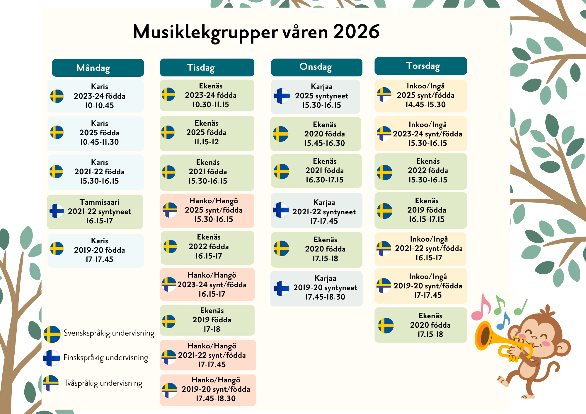 - Vårterminens undervisning i musiklekis börjar den 7 januari 2026 enligt läsordningen.
