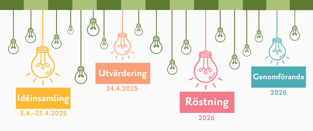1. Idéinsamling (3–23.4.2025): Under denna period kan du lämna in dina idéer som är möjliga att genomföra med hjälp av medborgarbudgetens anslag.